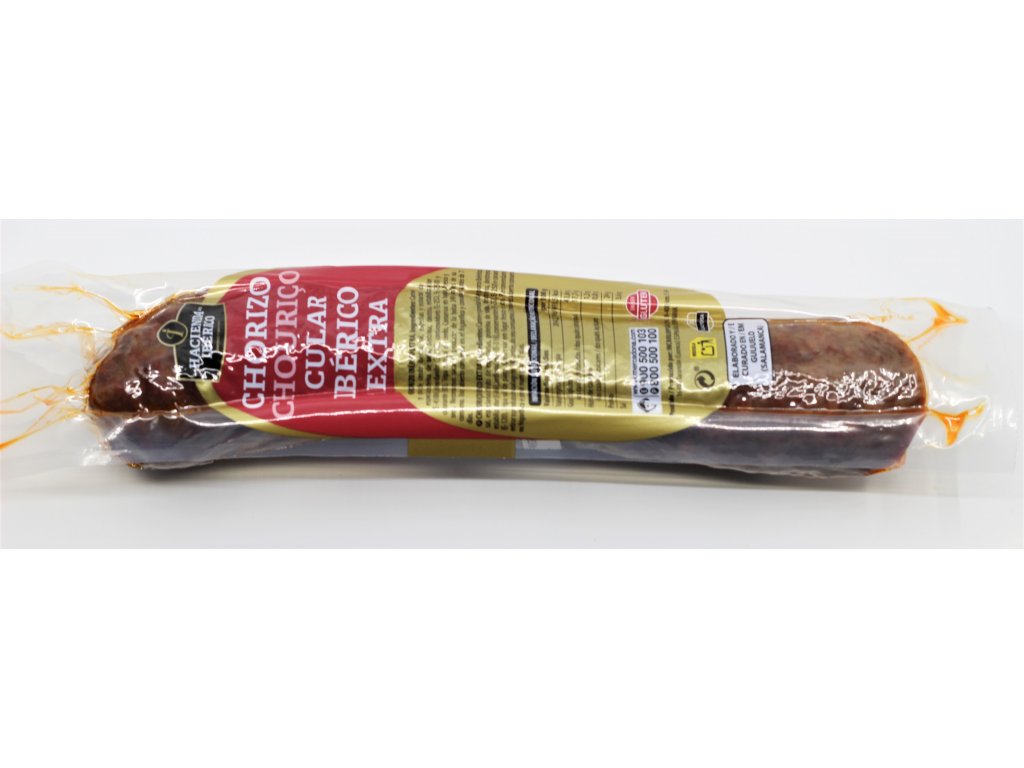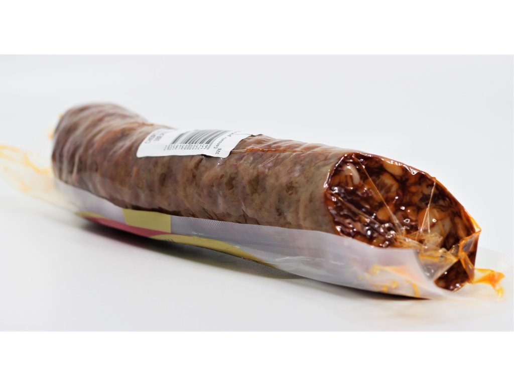 Složení: maso z vepře Ibérico, sůl, koření, sójový protein, dextrin, dextróza, E450iii, E316, E252, E250, E120,