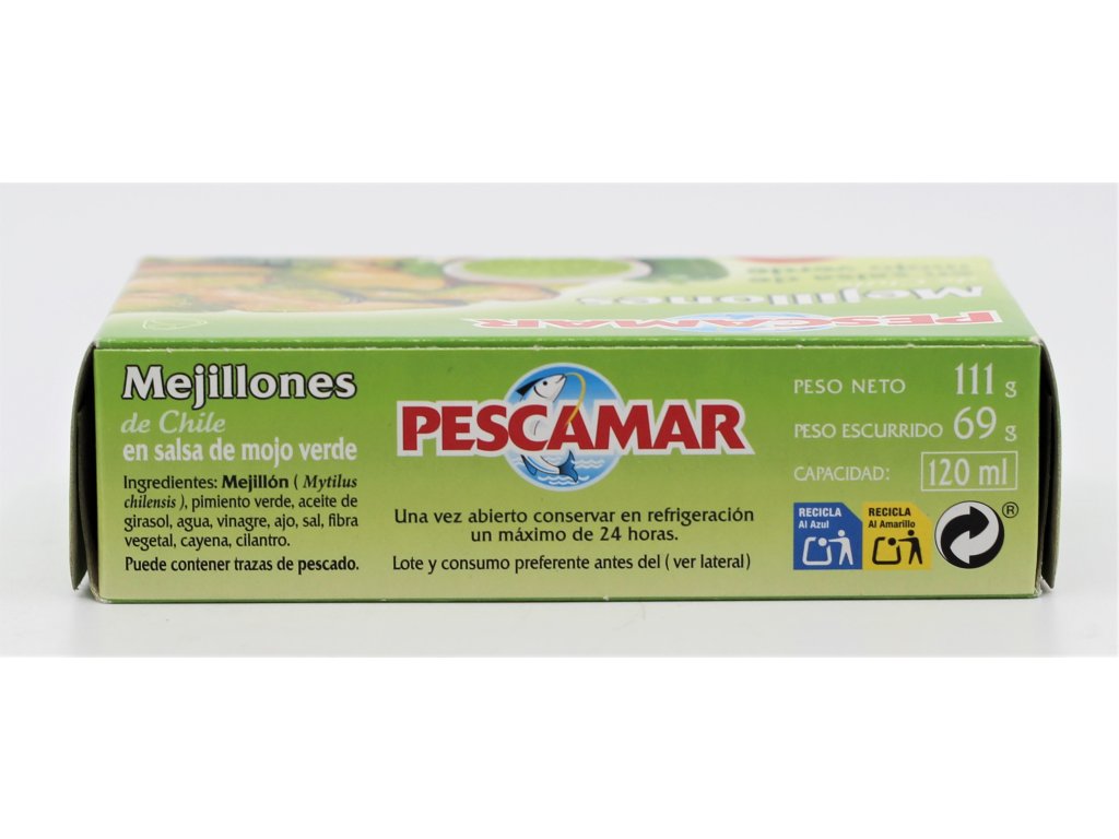 Složení: mušle (Mytilus chilensis), zelená paprika, slunečnicový olej, voda, vinný ocet, česnek, sůl, rostlinná vláknina, kajenský pepř, koriandr.