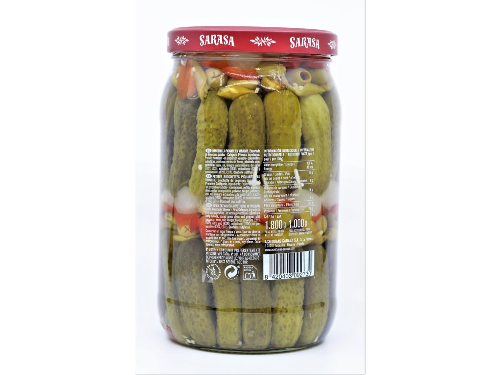 Složení: okurka, cibulka, zelené olivy bez pecek, červená paprika, chilli, voda, sůl, vinný ocet, E 621, E 635, E 330, E 300, E 202, E211.