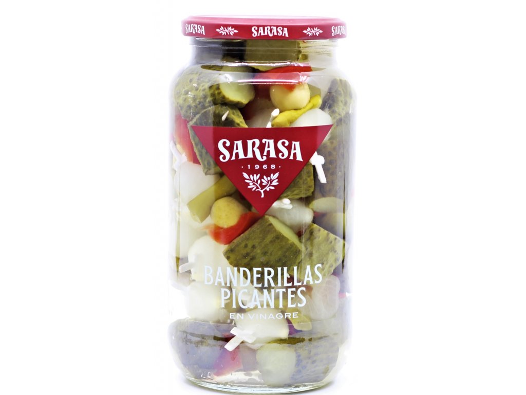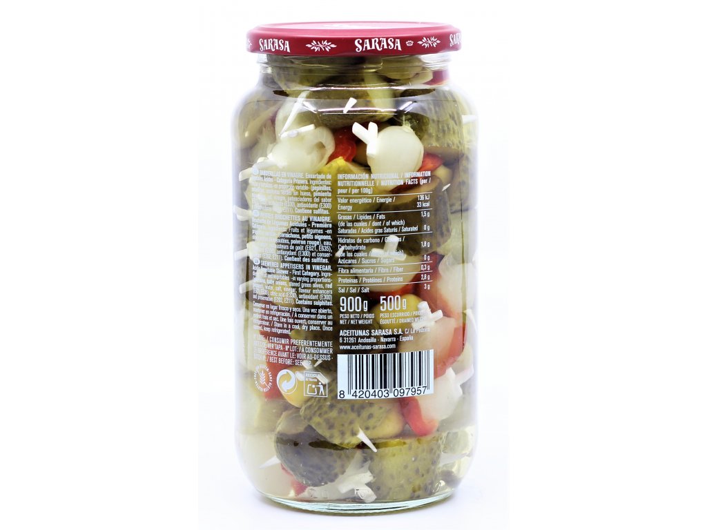 Složení: zelené olivy bez pecek, okurky, sibulky, červená paprika, voda, sůl, vinný ocet, E621, E635, E330, E300, E202, E211