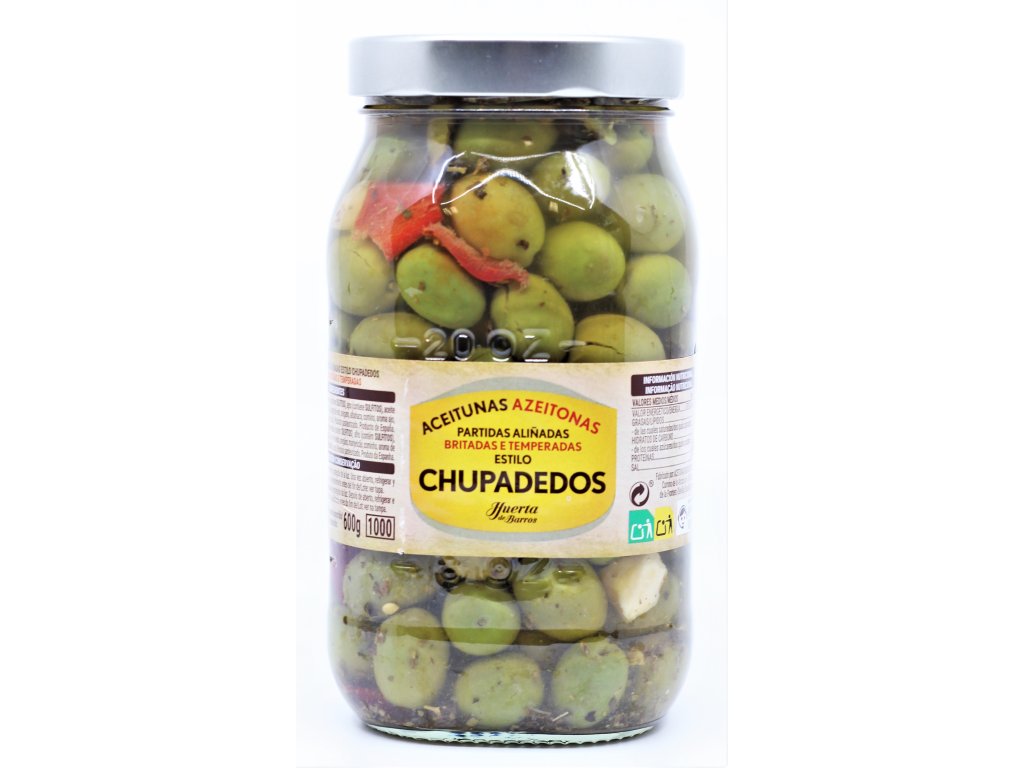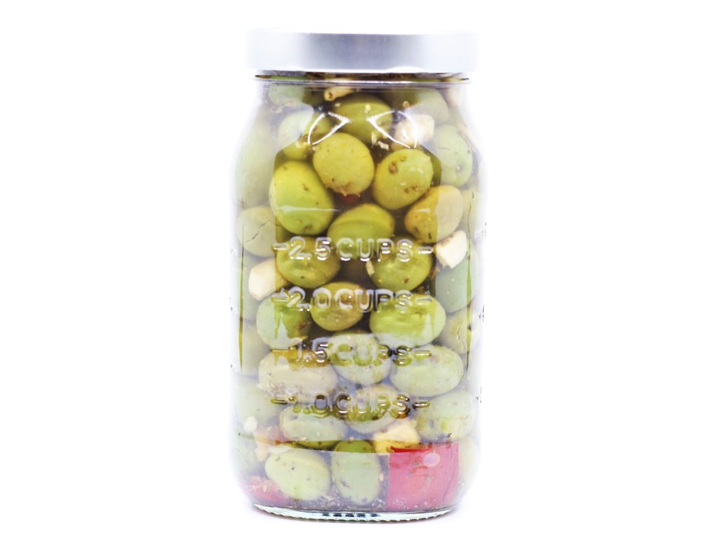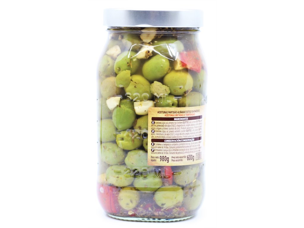 zelené olivy s peckou, červená paprika, česnek (obsahuje siřičitan), olivový olej, E621, vinný ocet, oregano, bazalka, kmín, aromata, minerál (octan zinečnatý)