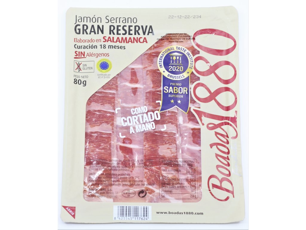 Složení: sušená vepřová šunka z růžových prasat, sůl, askorbát sodný, konzervanty