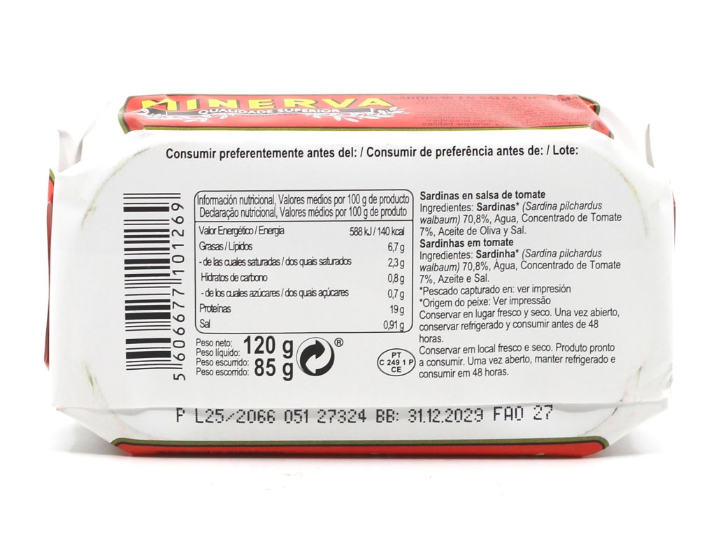 Složení: 70,8% sardinky ( sardina pilchardus walbaum), voda, rajčatový koncentrát 7%, olivový olej, sůl.